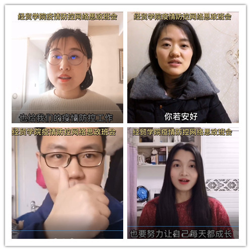 “同学们,你晚来或者更晚来,学院就在这里,不离不弃。”这是经济贸易学院心理专干刘丽霞老师在网络思政班会视频中一句饱含深情的语句。为了将班会开出实效,同时考虑到疫情之下的有限条件,该二级学院年级组长张婷、徐纹、江雯和刘丽霞4位老师,策划并录制了疫情防控网络思政班会视频,面向所有班级作为班会素材进行共享。该视频分别从“正确面对疫情,不畏惧、不麻痹”、“居家隔离搞学习”两个部分,向同学们讲述如何“不信谣、不传谣”、“增强自信、不恐慌”、“做好自我防护要记牢”,最终引导大家如何“让特殊的假期变得有意义”。“同学们,你们是否健康安全,能否好好的保护自己,是学院和老师们每天最关心的事情!”张婷老师在视频中说出了每一位辅导员、班主任的心声。“同学们,即使假期漫长,也要努力让自己每天都有收获!”江雯老师为同学们提出真诚的建议。“同学们,加油!健康依旧!阳光依旧!”徐纹老师代表辅导员和班主任为同学们加油鼓劲。